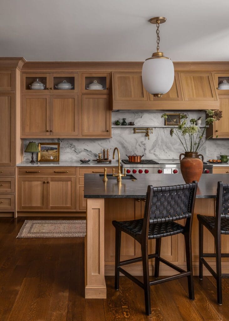 Fall’s afternoon light poured into the kitchen, illuminating oak cabinetry and veined marble like a living painting. Suspended above, Urban Electric’s Thistle pendant in found brass and opal glass shimmered like jewelry—delicate, sculptural, and timeless. Kitchens often serve as the emotional heart of the home, and this one called for a softer editorial lens. My composition highlighted craftsmanship while preserving mood, crafting a visual language that blended quiet luxury with approachable warmth. The result was contemporary elegance that felt timeless.