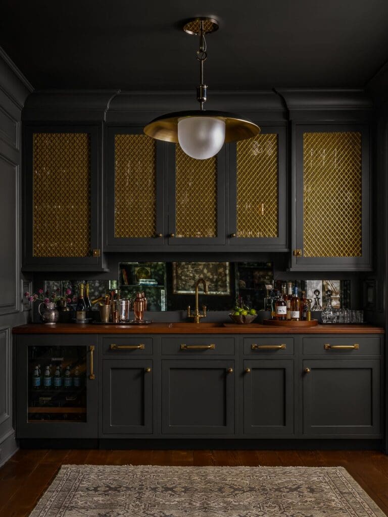 Across the project, we moved between the tones of luxury: the quiet drama of a green butler’s pantry, the golden serenity of a sun-drenched kitchen, the deep wood and brass warmth of an atmospheric bar. The bar sets the tone with warmth and shadow layered beneath Urban Electric’s Gardener V.2 in heirloom finish. Brass accents and rich wood glow in the fall light, inviting a quiet evening of bourbon or bubbles. Here, my role wasn’t only to photograph but to shape the light—directing the balance of contrast and detail to highlight the mood. It’s not just an image of a bar; it’s an invitation to linger.
